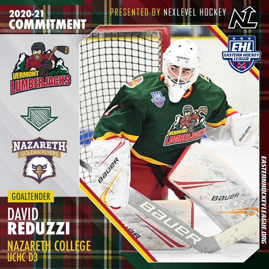 BURLINGTON, VT -- The Vermont Lumberjacks are pleased to announce that David Reduzzi has committed to Nazareth College for the fall of 2021. The 2000-born native of St. Charles, MO spent two seasons with the Lumberjacks, and throughout that time won 39 total games in the Eastern Hockey League (EHL). Overall, Reduzzi finishes his junior hockey career ranked as the 9th winningest goaltender in league history.