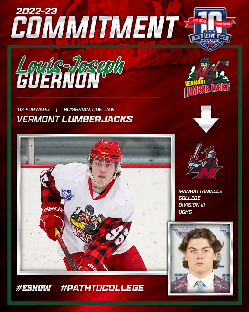 BURLINGTON, VT – The Vermont Lumberjacks are excited to announce the commitment of Louis-Joseph Guernon to Manhattanville College this Fall of ‘23. The three year EHL forward for the Lumberjacks racked up 52 points and 23 goals this season.