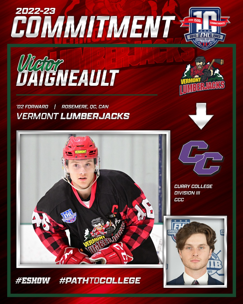 BURLINGTON, VT – The Vermont Lumberjacks are pleased to announce the commitment of Victor Daigneault to Curry College this Fall of ‘23. The third year EHL forward for the Lumberjacks posted an impressive 55 points and 22 goals this season.